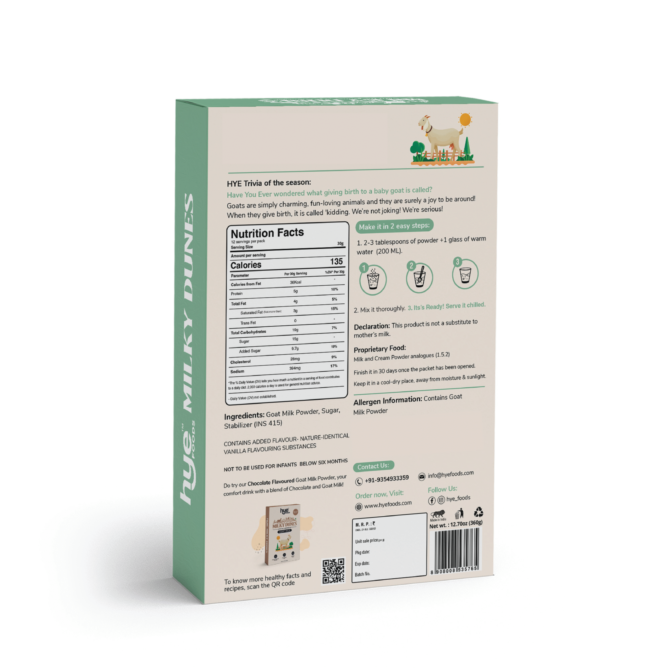 Hye Foods brings to you Goat Milk Powder in Vanilla Flavour, the latest addition to our Milky Dunes range! Having sourced the Goat Milk freshly and ethically, Hye Foods Vanilla Goat Milk Powder has a creamier texture, which is hard to miss! It is nutritionally rich and contains all the essential fatty acids. It contains the most delectable vanilla flavour and is suitable for children as well as adults! Add taste and health to your everyday dairy with a twist of Vanilla Flavour Goat Milk. Give your cooking a new style of aroma that is authentic and flavourful with Milky Dunes Vanilla Goat Milk Powder! Make milkshakes, smoothies, cakes, pancakes, etc. and enjoy them with your loved ones! An authentic taste and mouthfeel of vanilla, packed with the goodness of Goat Milk makes it all the more worthwhile and is sure to make you healthier!